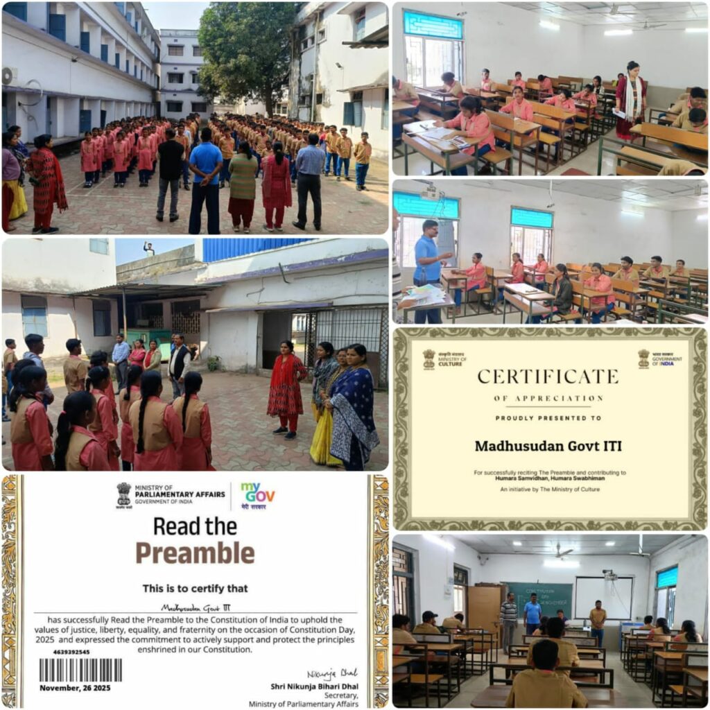 Madhusudan Government ITI, Choudwar, celebrated National Constitution Day today with great enthusiasm. To commemorate the occasion, a Painting and Quiz Competition was organised, providing students with an opportunity to showcase their artistic talents and knowledge of constitutional rights, duties, and national unity.